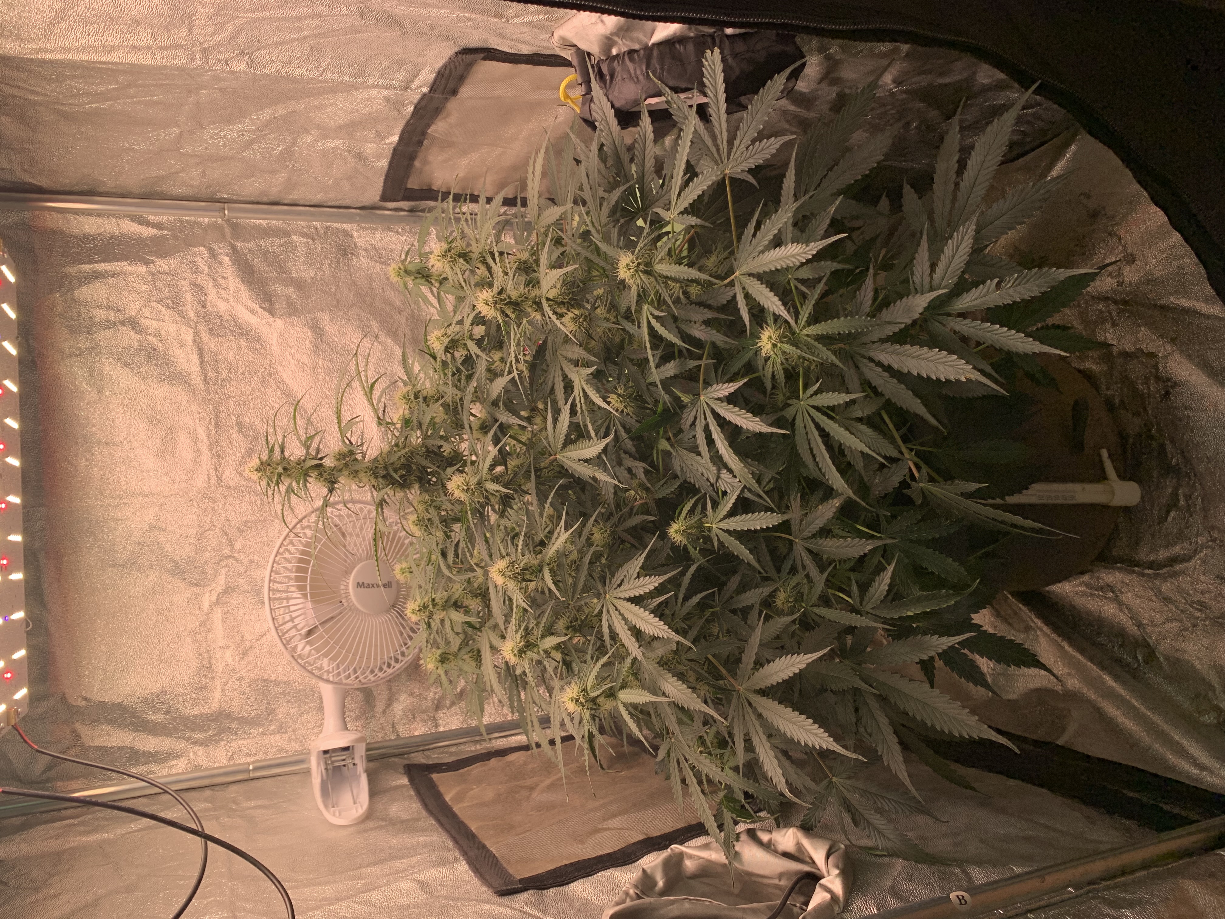 Вот прошел ещё один месяц моего грова,продолжаю обзор. Как раз сейчас Мимоза идет бонусом по промокоду, многим должно быть интересно. Сегодня растишке около 60 дней, гляньте что за монстр растёт. Я такое поднимаю впервые, до этого были низкие скороспелые индики типа Fast bud. Тут же совсем другое дело- доминантная сативка. Куст заполонил всё пространство 60х60, скоро придется проливать не доставая из бокса. Данный дуб потребляет 4,5л компота раз в 48 часов. Ппм держу в пределах 1000, передозов или дефов не видно. Вегетация была достаточно долгой, зацвел после 40 дня, по паспорту снять явно не получится. Но чувствую я ожидания должны будут оправдаться. Никакие подгибы я не делал, возможно зря. Теперь приходится прыгать вокруг него, решать какой бы листик срезать, чтобы свет попадал на соцветия. Через месяц отпишу по результатам, спасибо магазину за все бонусы и розыгрыши. <=